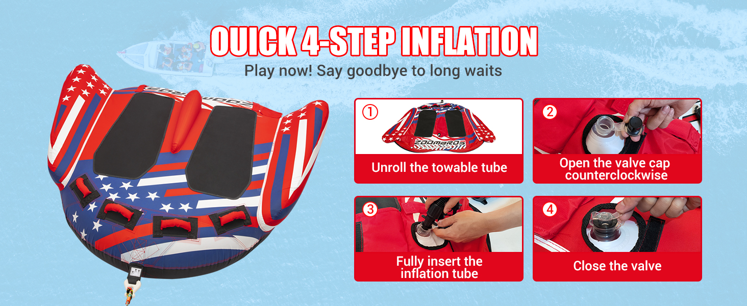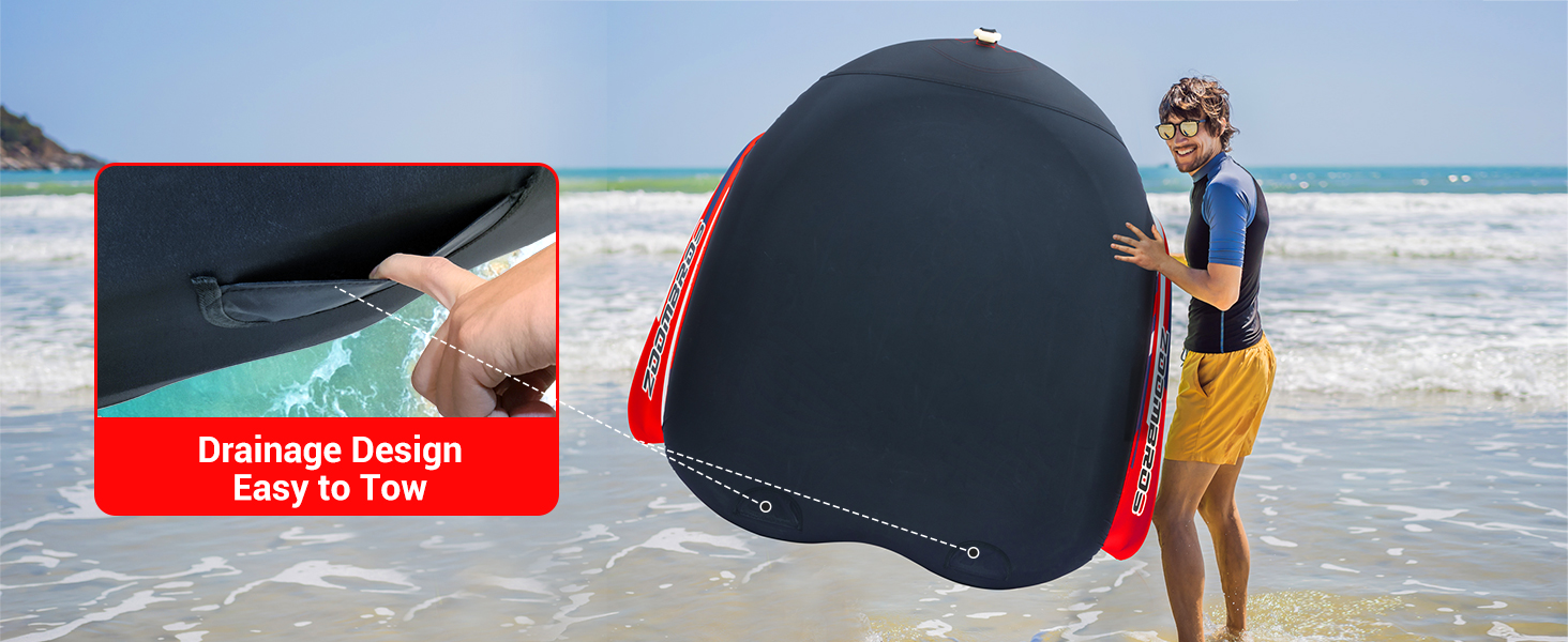 - SISTEMA DE REMOLQUE ULTRARÁPIDO: El conector de remolque delantero de servicio pesado solo tarda 30 segundos en conectarse a la cuerda de remolque. Cuenta con válvula de seguridad de velocidad para un inflado y desinflado rápido y fácil, ¡prepara tu tubo remolcable en poco tiempo! Este tubo de agua es compatible con bombas únicas en el mercado.